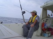 大雨波浪警報が出ているものの風もなく何とか出られそうなコンディションと、1ヵ月振りの釣行のこともあり心配しながらも七時、聖艇とともに桟橋を出っばつ。 金州は諦め合ノ瀬へ向かう。まずまずの凪で快調に飛ばすもポイントへ着く辺りから物凄い雨、バケツをひっくり返した様なすさまじい雨にしばし波任せ。小一時間も振られた後、雨上がり。早速仕掛けを投入するも全く当りなし。遊船も一艇もいません。その後、北堆エボシへ移動するも状況変わらず。鯖を一尾ゲットして昼前、風波が強くなってきたのを嫌いUターンとしました。 |