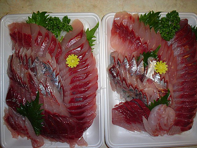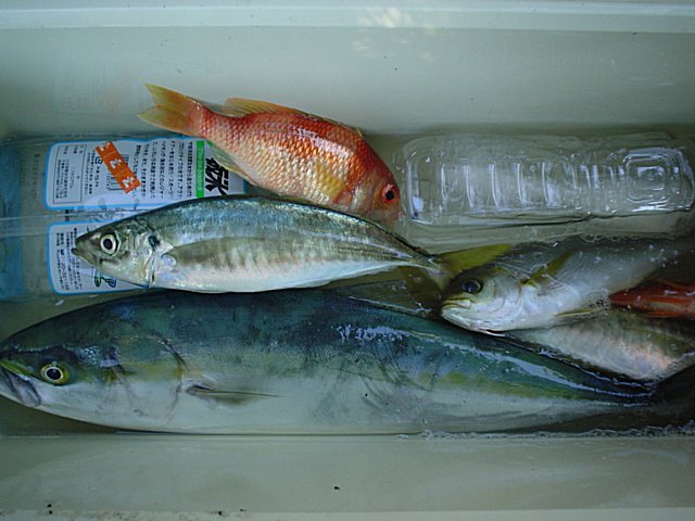 ワラサと鯵とイサキのお造りです。ワラサは羊羹切り、合わせて3k近くありましたからざっと10人前?(^o^)