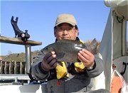 8時半前カドに到着、潮流れはあるものの南東へトロ〜リの0.7kt、水温14.5℃やや濁り潮。一流し目、風と潮が合い間ってアッという間に南へ流される。二流し目、本日の初見えは2.5kg56cmの型の良い真鯛です。続けてメジナとメバルが、三流し目、またまた小型の真鯛がヒット。1時間ほど過ぎた頃、急に西風が吹いてきたのを観て即座にUターンし御前で再度アンカーリング。