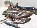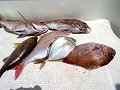 寝坊して目が覚めたのはナント9時過ぎ!今日は沖を諦めました。ケンチャンから御前情報が携帯に入り全く芳しくないとやら、浜岡沖に出ているマリーナ僚船からもギブギブアップコールが。それではキスの状況はどんなものかいなと、今期初の超近場の大井川河口へ向いました。 仕掛けを垂らしキスの当たりを待つこともなく一尾二尾三尾とほぼ入れ食い状態、型はまだまだの10〜15cmの小ぶりばかりですが1時間半余りで10尾を数えました。何年ぶりかでヒイラギ(ジンダベラor猫またぎ)の顔も見ました。(^^) 短時間でしたが、無風べたべた凪にの〜んびりした釣りを久々に堪能しました。マダイのあたりとは違った「プルプル感」、これはこれでまた良いものですね。 |