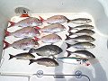 出遅れの七時、釣友聖艇と毎度のポイントに入りました。凪予報はドンピシャ!東からのそよ風に澄潮は南にトロ〜リ、水温18.6℃とのんびり楽しい釣りをするにはベストコンディション、あとは魚が口を使ってくれれば最高なのですが。 第1投目いきなりヒット!2投目またもやヒット、3投目またまたヒット、4投目どうしちゃったのか、またもやヒット!ナンと4連続ヒット、こんな入れ食い状態は初めての経験です。あ〜あ急がしや急がしや〜。イケスは1時間足らずで満室状態。(^^) その後当たりは遠のくも、潮と風とが合い間って東に流され西に流され北に流されながらもポツリポツリとイサキやらメジナやらもゲット。ゲップが出たところで沖上がり、滅多にないべた凪のカド根を11時過ぎ後にしました。今日はなんだったんでしょうか?。まるで九連宝燈かホールインワンか?明日も二匹目のどじょう を探しに行かなくっちゃ−(^^) |