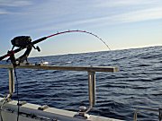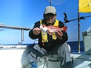 朝方は御前で縞鯵狙い、その後沖の深場で赤ムツを狙うプランで七時前マリーナ釣友の聖さんと出港。まずは御前第Vマイポイントへアンカーリング。潮は昨日とほとんど変わらずドロ〜ッとした溜り潮。二時間ほど粘るも外道もこず。 東海根東150〜300mラインへ移動して赤ムツ・沖カサゴを狙う。西風に北への入り潮?全くおかしな潮具合です。一流し目、ドンコが一荷で。二流し目、又もやドンコが。続けて三流し目、小気味よく竿が踊り何やらヒット、290mから巻き上げするも竿は踊りっぱなし。これが聞くところの赤ムツの曳きですか。はまりそうですな。(^o^) 深場デビューで36cmの赤ムツをゲット。その後、西の風が強くなるを観て昼過ぎ引き上げとしました。 今日はファルコンさん御一行様とお丸さんにVでつなげていただき、スキッドさんとは携帯で情報交換しました。 |