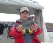 を行い8時、ようやく第一投となりました。 海面は強い北東風でドタバタ、潮は南東へトローっと流れる最悪のコンディションです。凡そ30分後、ベラや子カサゴの外道が食いついてきた。と、それからはイサキやメジナがまずまずの間隔で両舷竿にヒット。石垣鯛の当りは本命ゲットを思わせる強烈な曳きでした。 その後、治まりそうもない風を観て11時帰還としました。が、ナント港に着く頃には風が治まりベタ凪になったではないですか。(-_-;) |