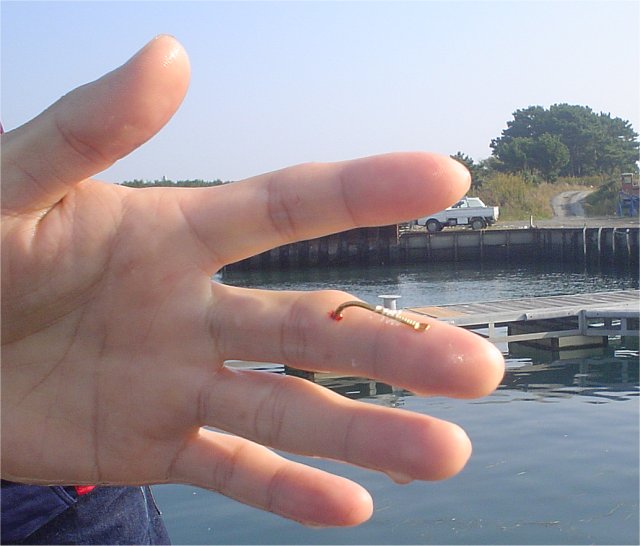 夜明け前、桟橋出っパツ、昨日のリベンジに東海根へ入る。ネプさん指南で協定竿出し時間10分前にはスタンばった。今朝は昨日の半分余りの遊船。七時、第一投、二投、三投・・・・・ファーストヒットは30分過ぎ、JMX竿先が海面に突っ込む。電動での巻き上げが効かない、竿の根元までひん曲げる強い曳き、シメシメっとっとっと上ってきたのは丸々肥えたスマでした。 その後、ポツリポツリと本命上るも昨日同様、八時過ぎには全く当たりが遠のいた。と、そんな時、Jrがなにやら「痛てて、痛てて!」オットー、なんとワラサ12号針が中指にガッシリかかっているではないですか。しかもどうやら骨にも達しているようだ。こりゃイケン!仕舞い支度もそこそこに急ぎ港に戻った。詳細は→ |